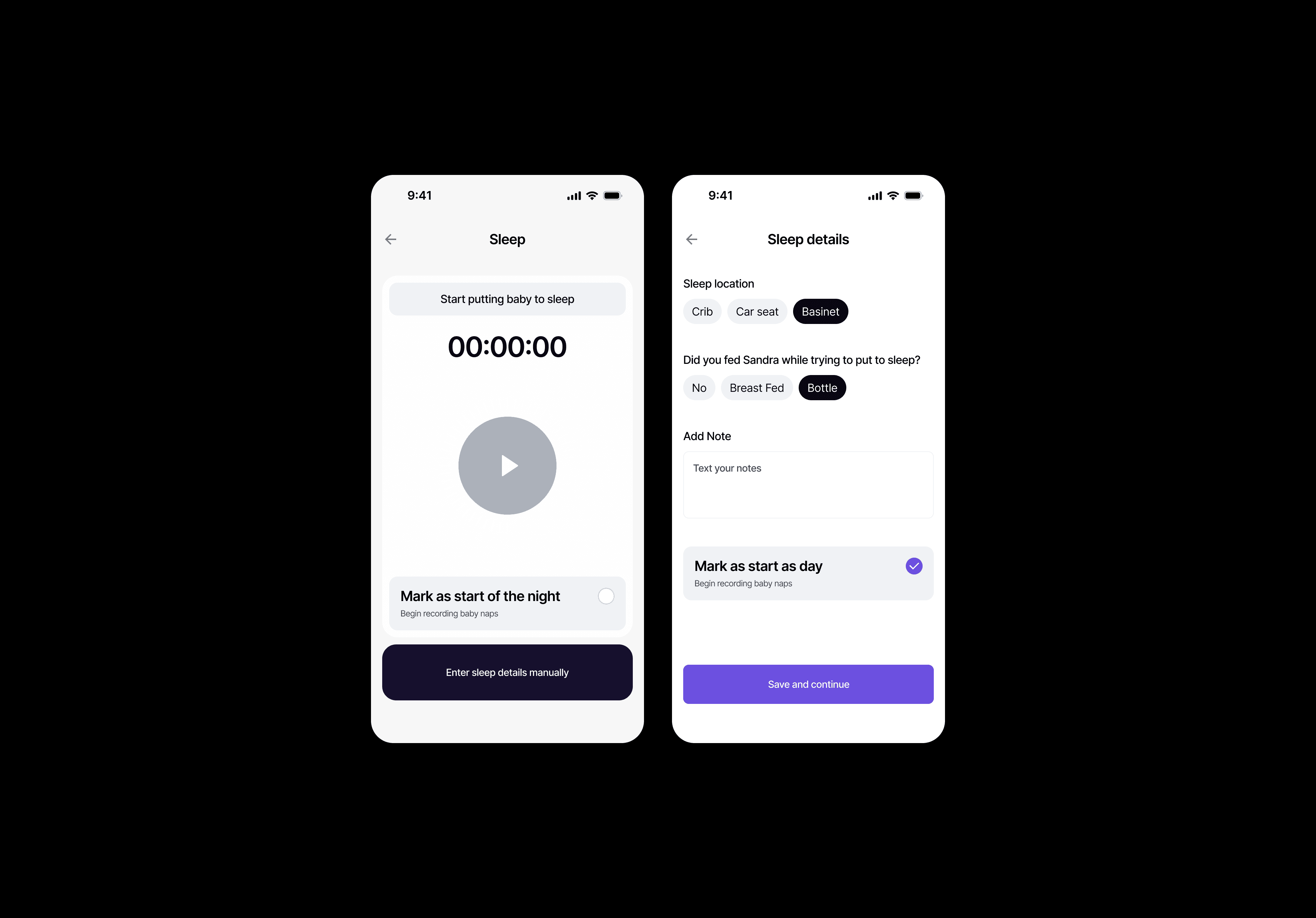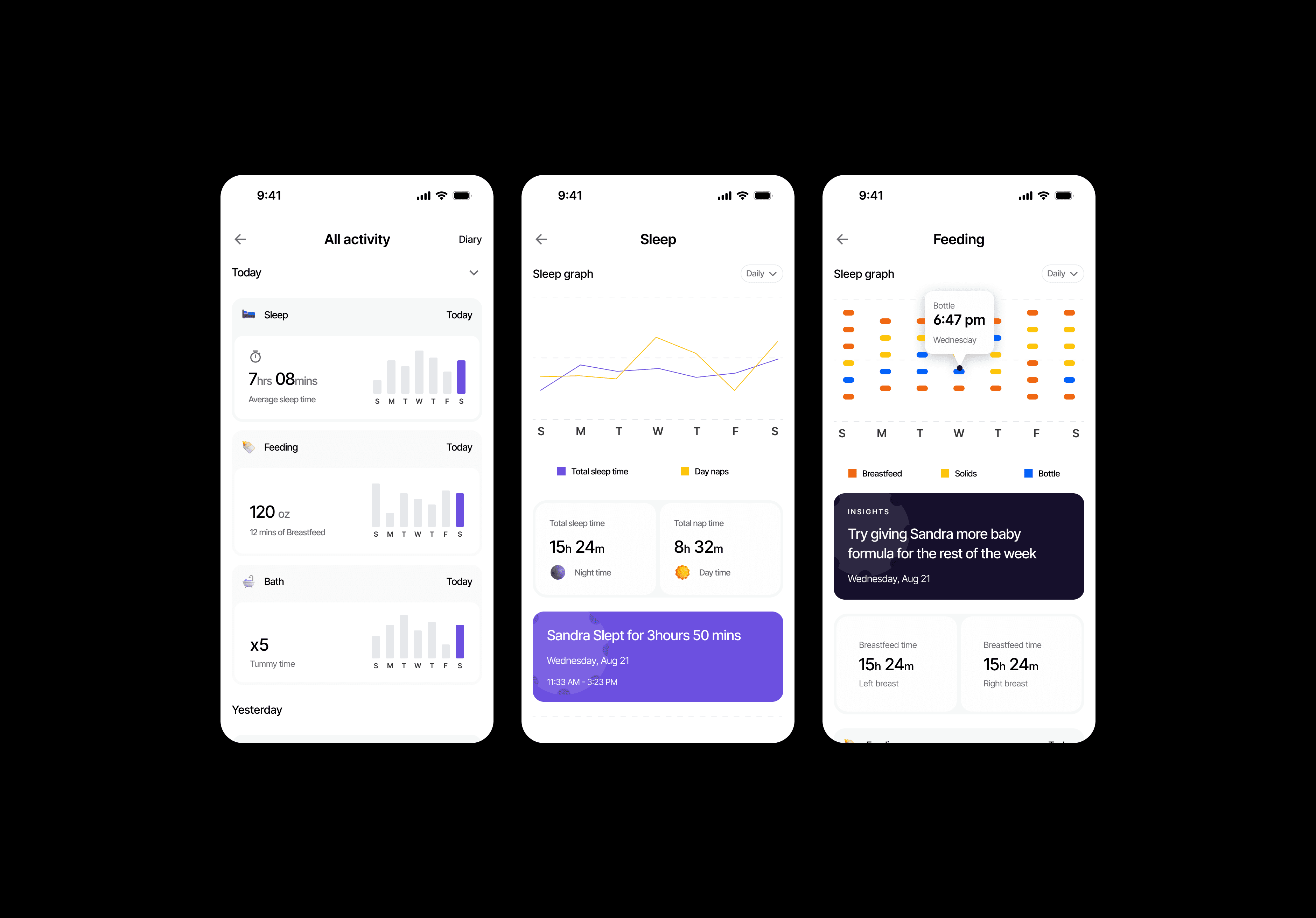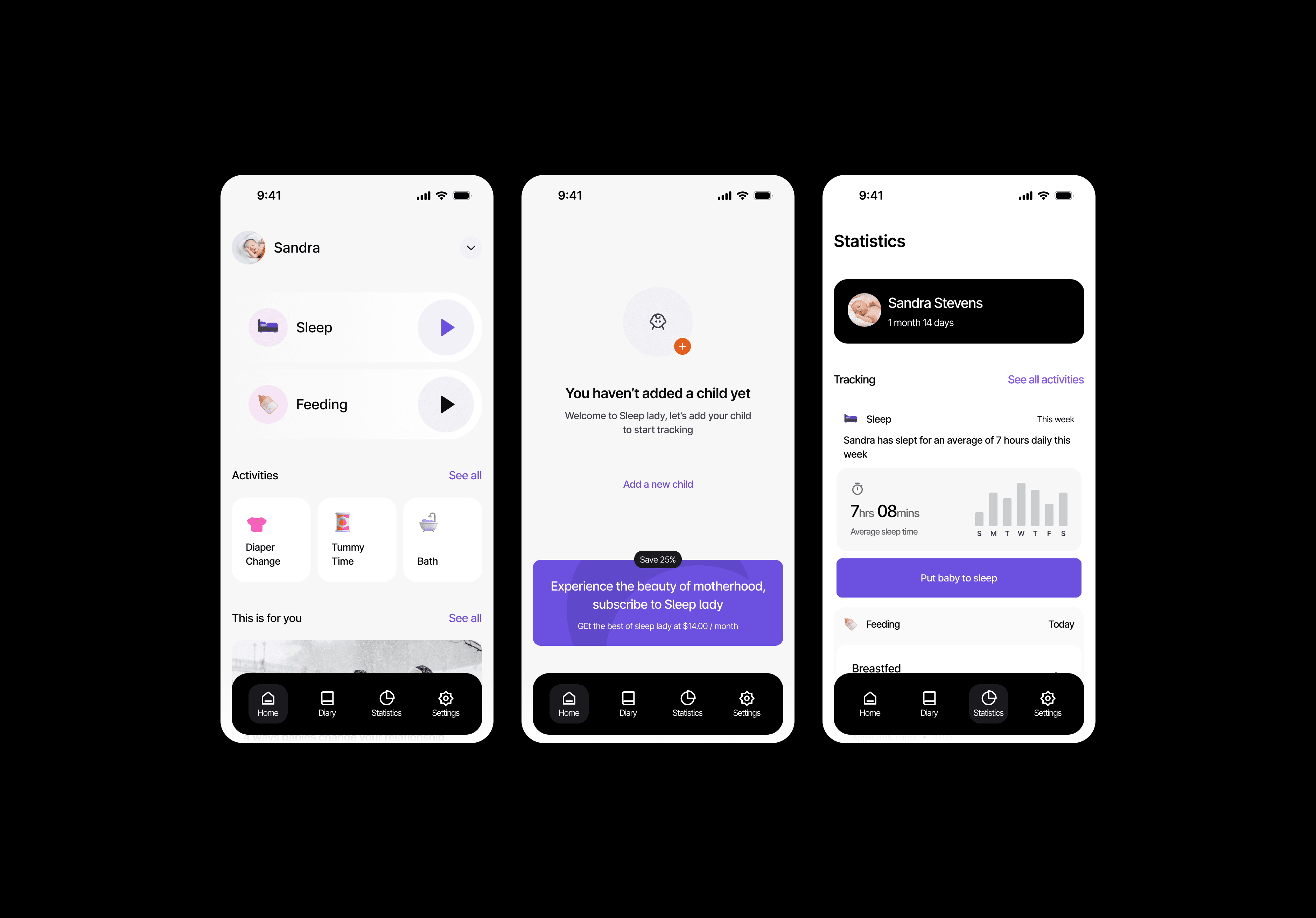 Sleeplady is a mobile product designed for nursing mothers to help keep track of their babies' activities such as sleep, feeding, diaper change, etc. This then helps parents understand their baby’s sleep, feeding, or diaper time patterns as well as help the parent plan out their routines around these patterns. Sleeplady also uses AI to send customized messages and notifications based on the metrics recorded. Sleeplady was designed in about 4 weeks with a team of 1 designer and 1 project manager, and the Client